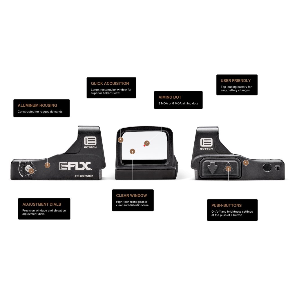 Nový otevřený reflexní kolimátor EFLX Mini Reflex Sight je první příspěvek americké značky EOTech do světa NEholografických kolimátorů. Ideální kousek pro profesionální použití, lov, sebeobranu, který je možno nasadit na různé zbraně. Primárně designovaný pro pistole, tento kolimátor využívá montáže Leupold Delta Point Pro, popř. je možno použít montážní adaptér. Mimo jiné tento kolimátor skěle poslouží jako doplněk k puškohledu. Odolné hliníkové tělo přináší velké čtvercové okno, podobné jako u holografických kolimátorů EOTech, díky čemuž bude zaměření snadné. Můžete si vybrat mezi 3 nebo 6 MOA verzí, baterka 2032 vydrží cca 20000 hodin a dá se vyměnit bez nutnosti kolimátor demontovat a nastřelovat. Celkem devět úrovní jasu včetně podpory noční vize už je jen třešničkou na dortu jménem EOTech EFLX.